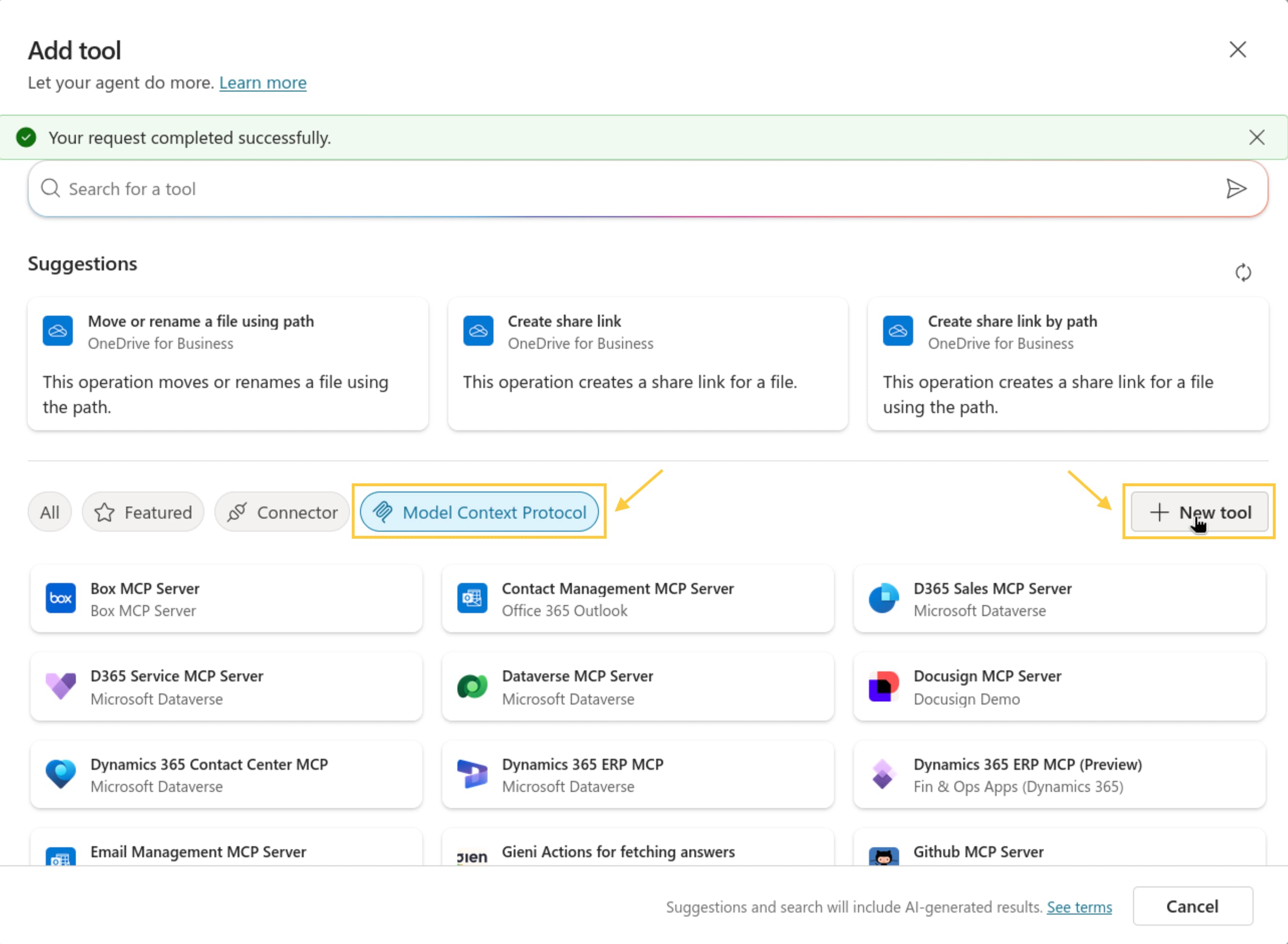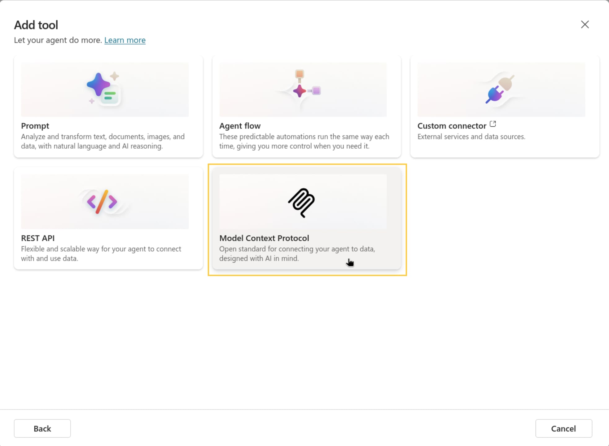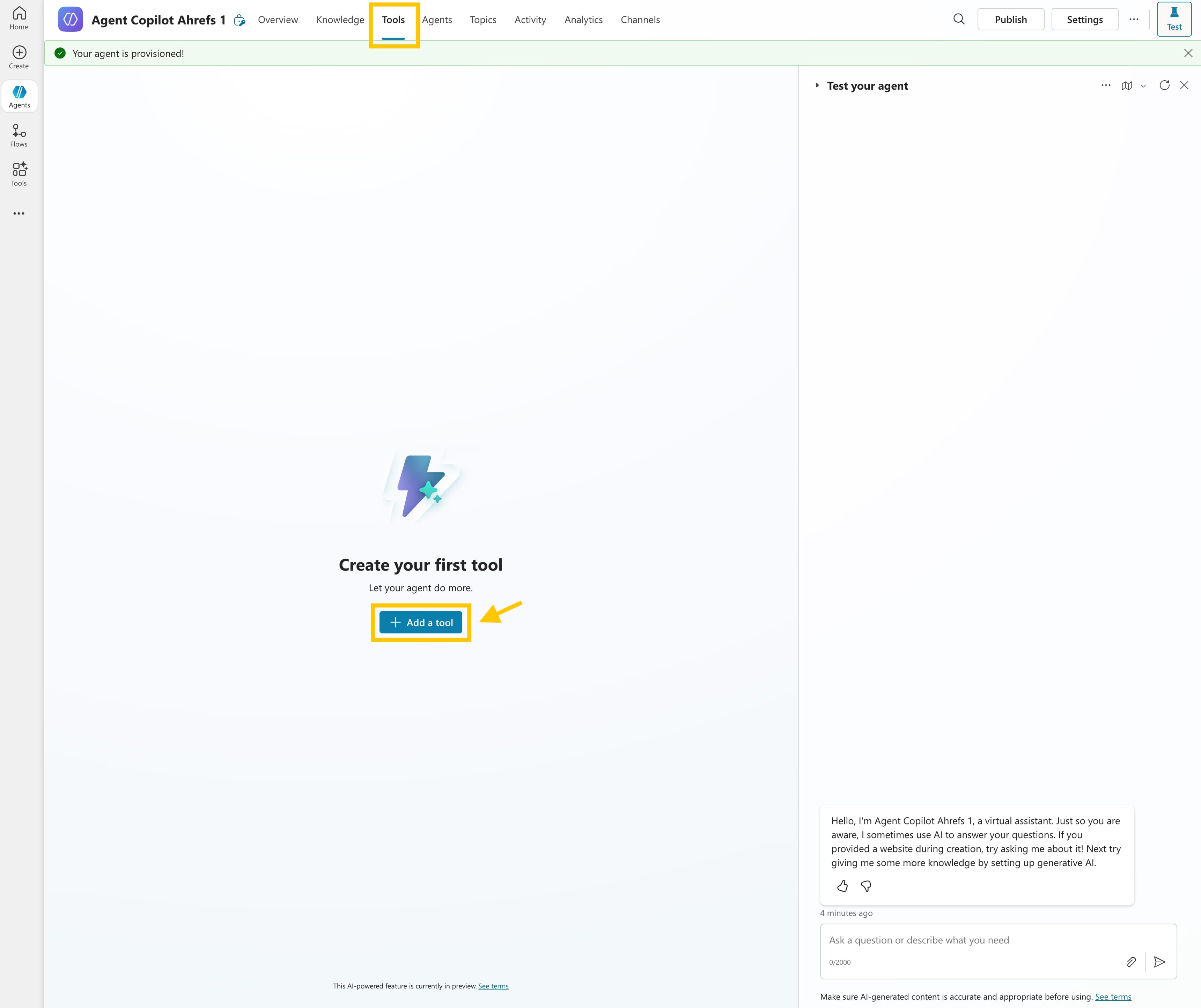 - Under "Tools", click "Add a tool" to attach a connector or custom action.