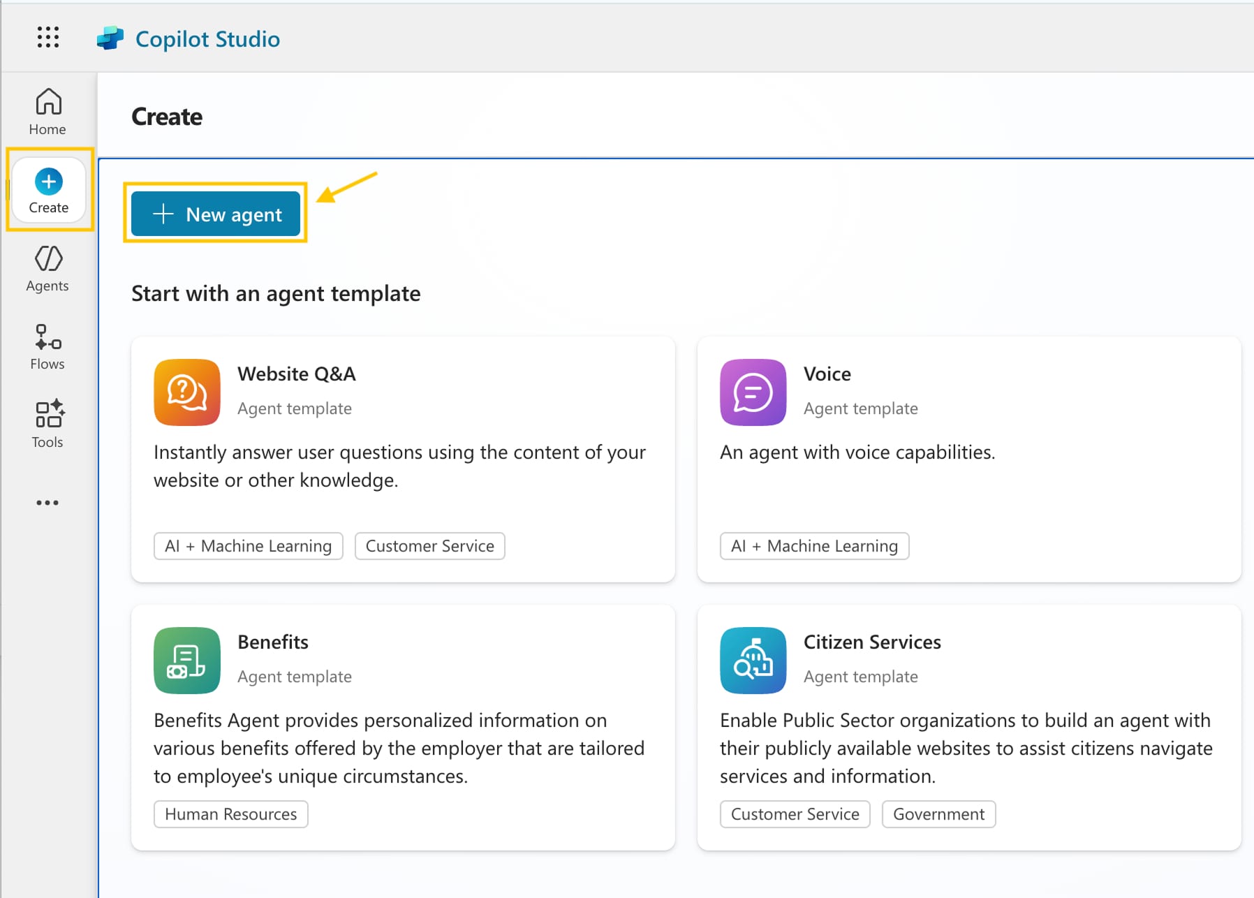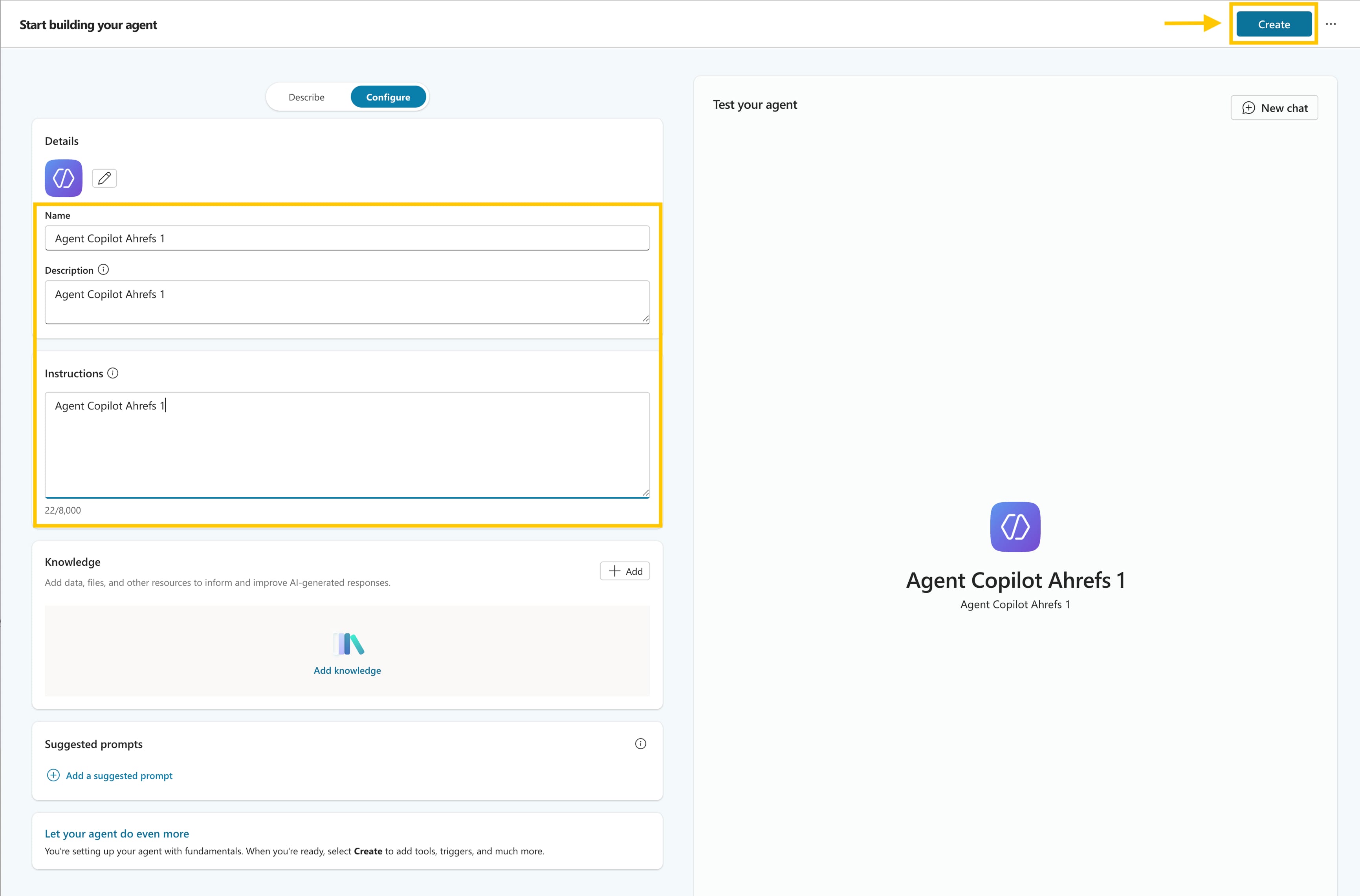 - Enter the agent details: Name, Description and Instructions and click "Create".