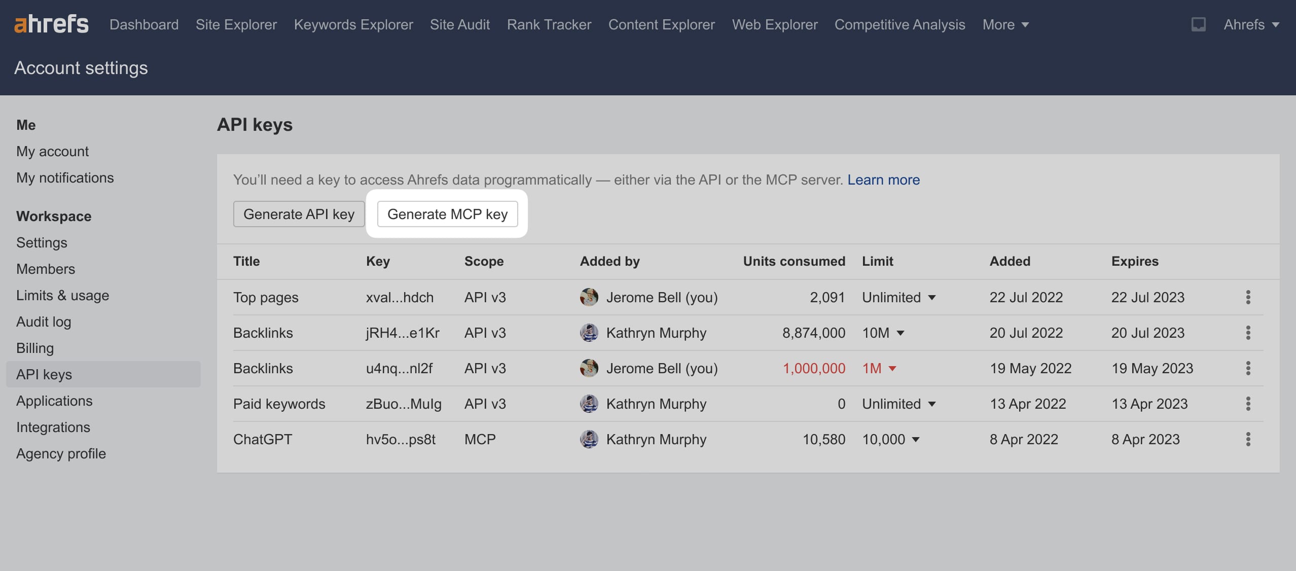 - Go to Ahrefs workspace → Account Settings → API Keys and click "Generate MCP key" to create a new key.