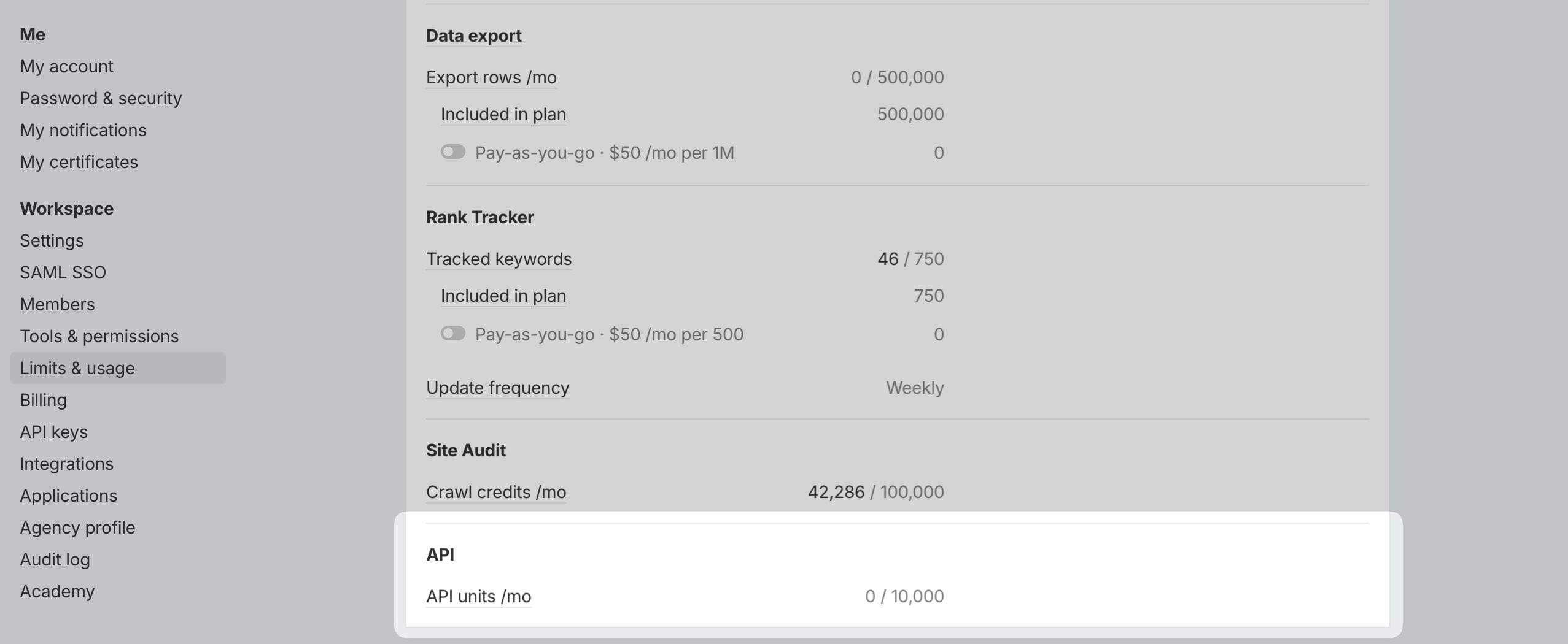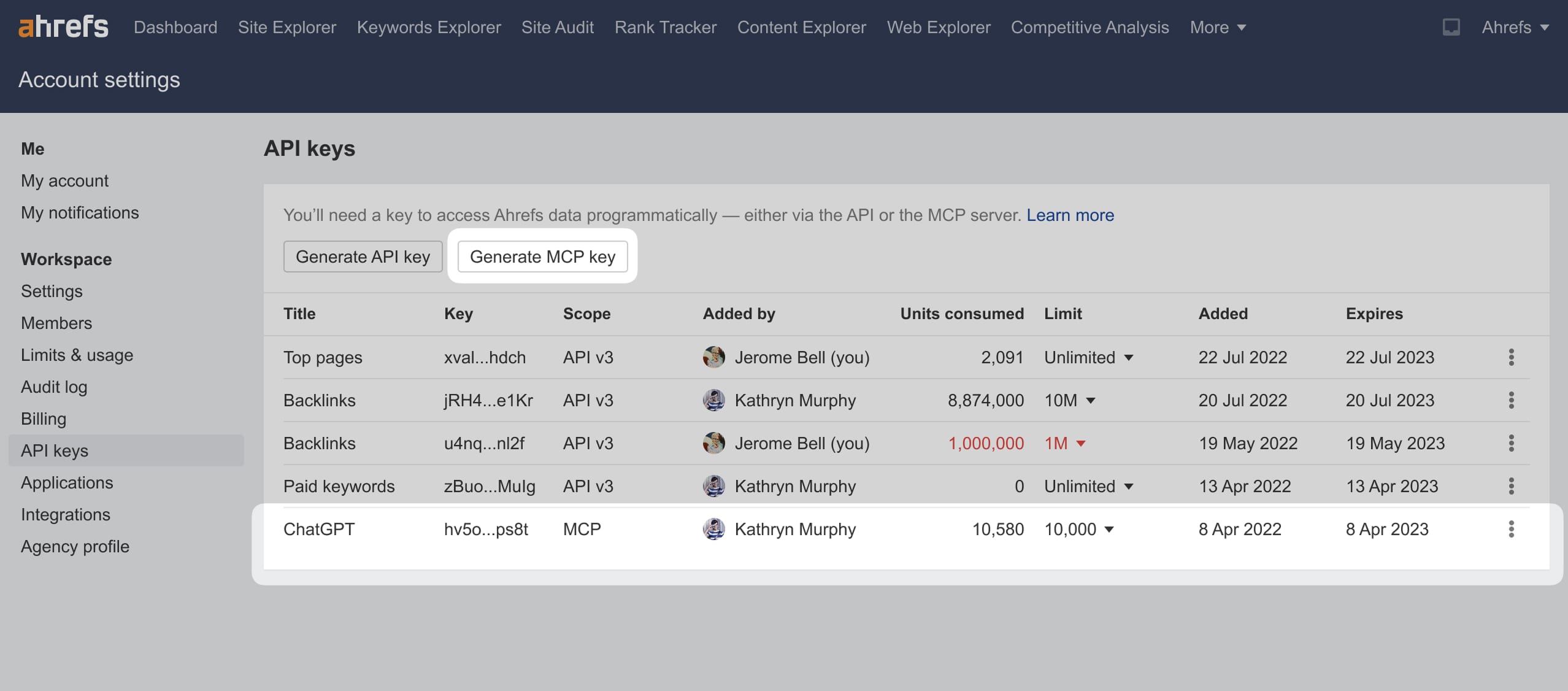 MCPscope). - Workspace admins can set a monthly API unit limit for each key in the API keys report to prevent over-usage.