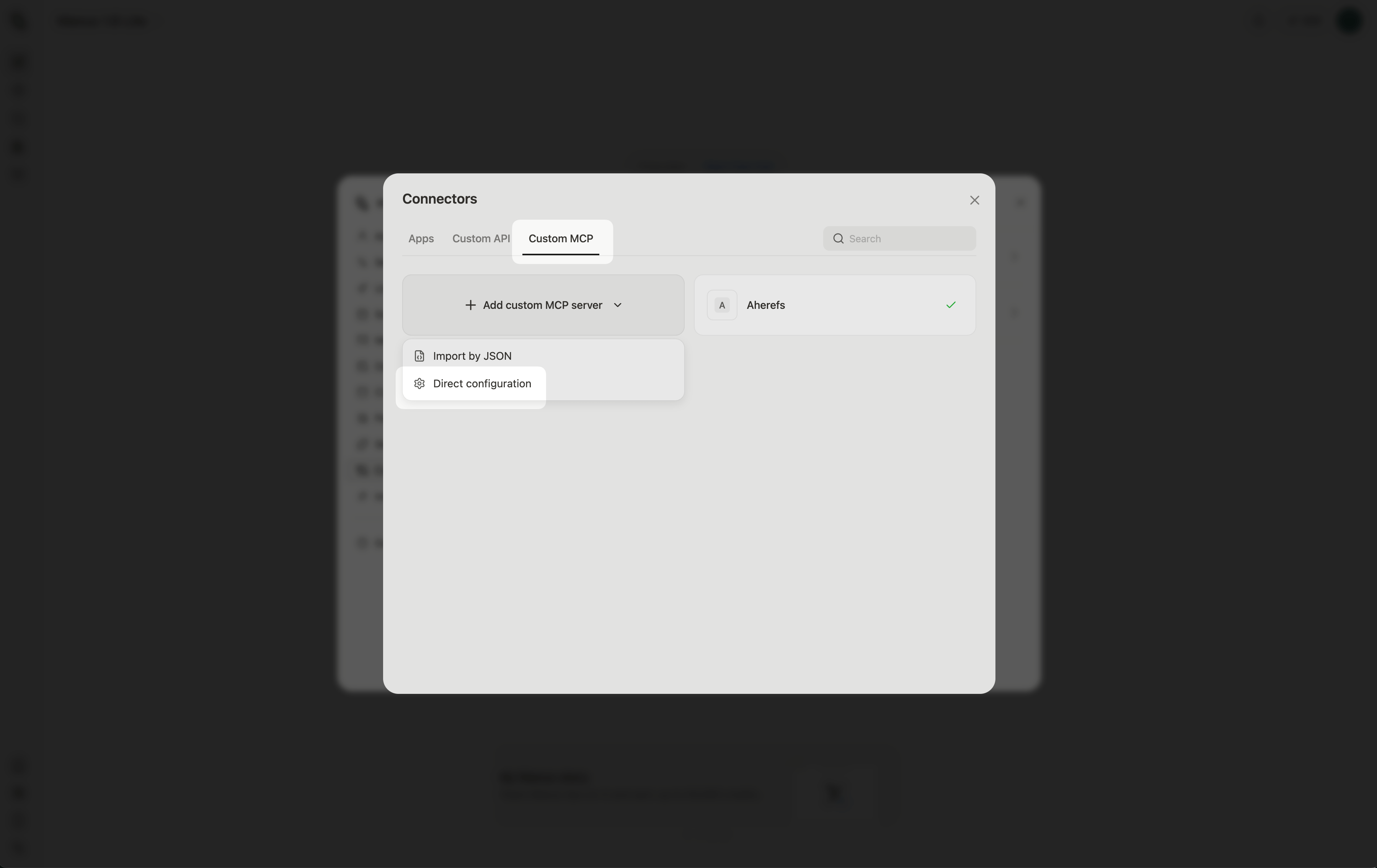 - Select the "Custom MCP" tab, click on "Add custom MCP server" and choose "Direct configuration".