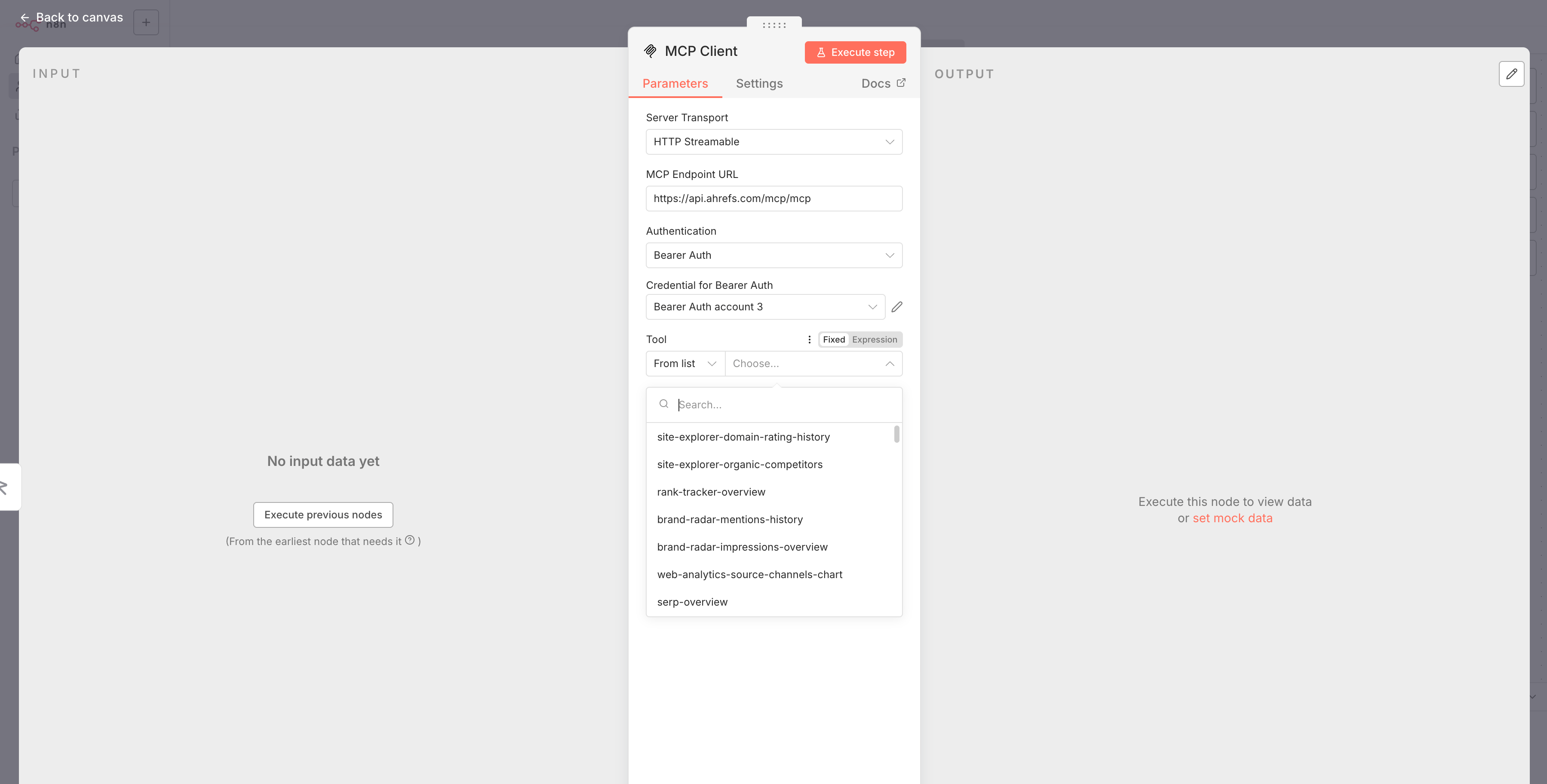 - After saving the credentials, you will return to the node settings. Refresh the list of tools, select the tool you need, and proceed with configuring its fields. You can refer to the Ahrefs API documentation for guidance.